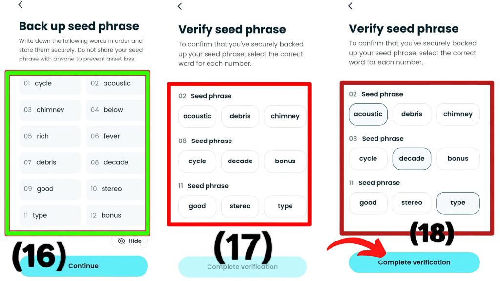 (17) Continue karne ke bad Verify seed phrase karna (02 ka Seed Phrase h – acoustic) (08 ka seed Phrase h – decade) (11 ka seed Phrase h – type )